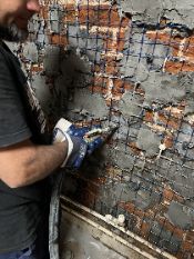 Подготовка поверхностиПоверхность очищается от пыли, грязи, старой краски и других загрязнений. Удаляются отслаивающиеся фрагменты бетона или кирпича. При необходимости проводится шпаклевка и выравнивание поверхности.